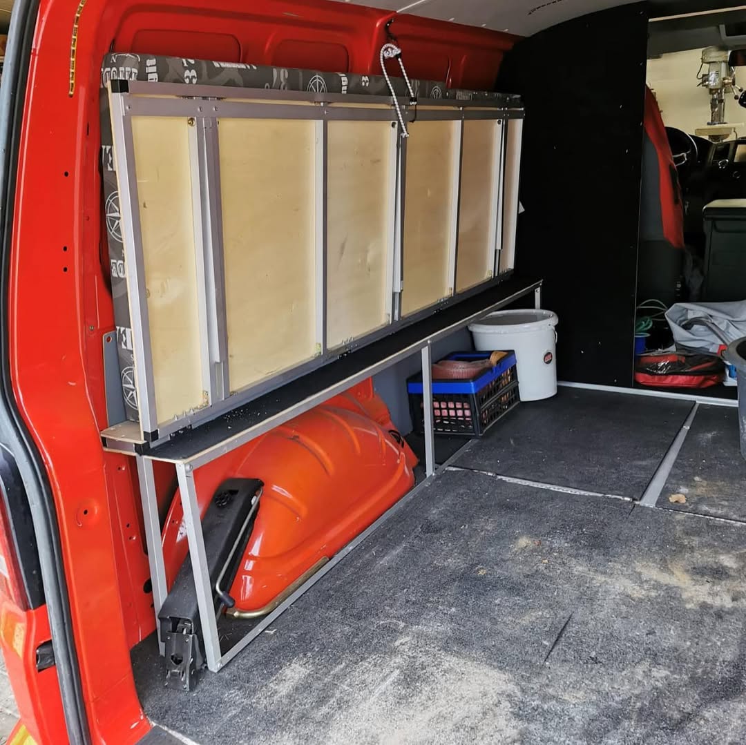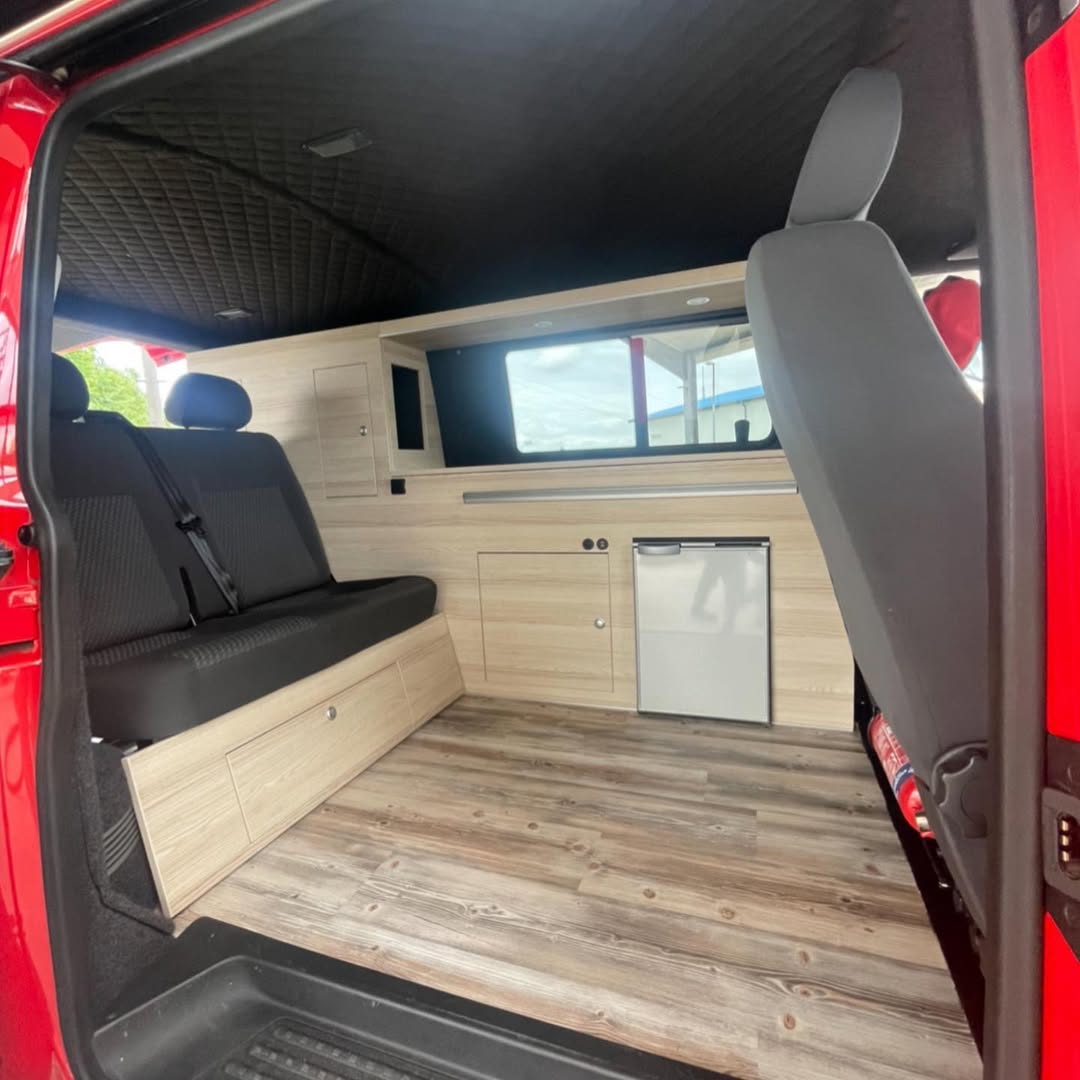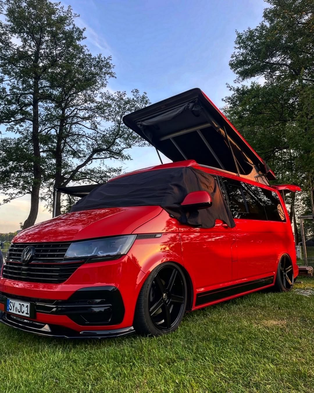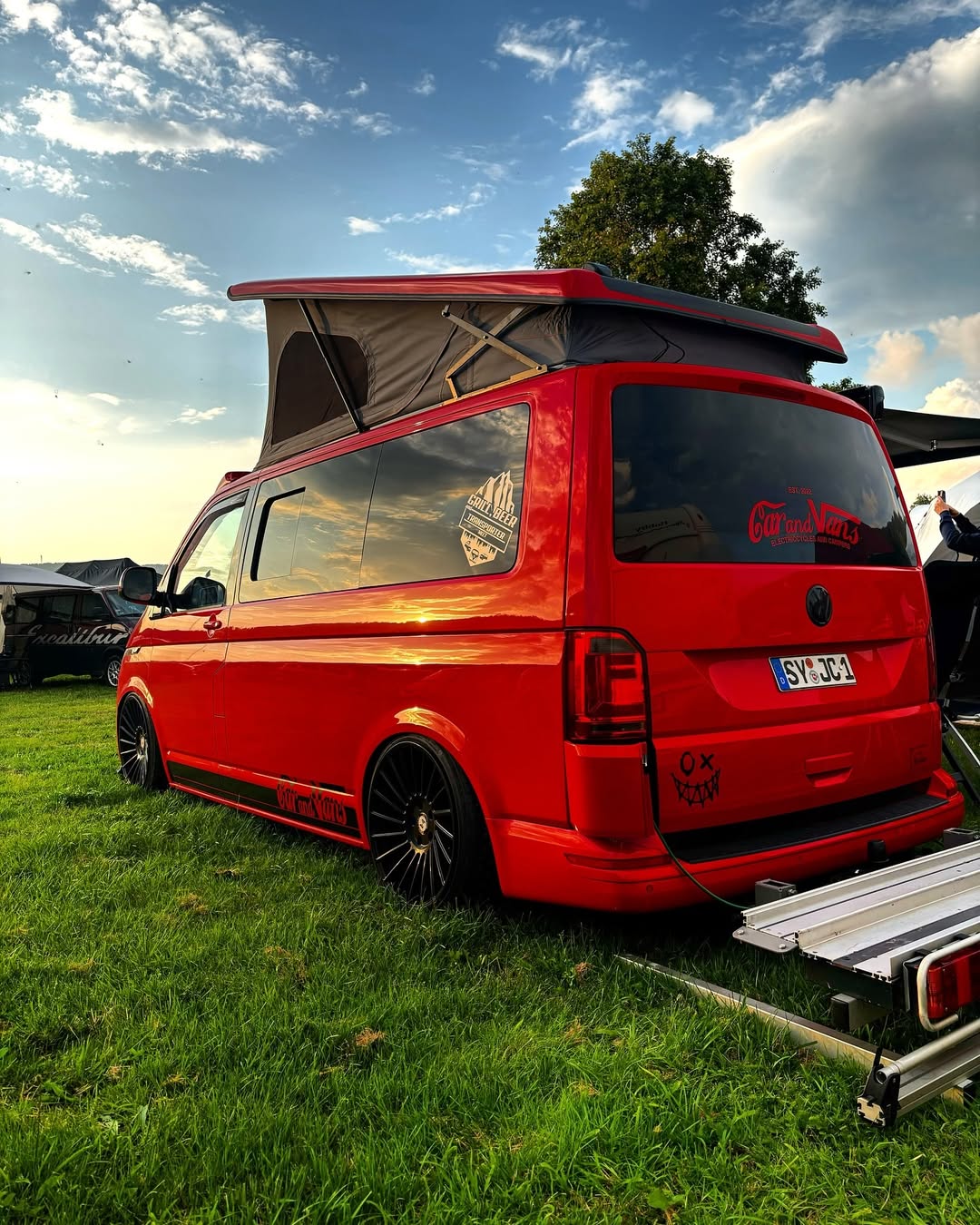 Ein Projekt, das die Handschrift von Car and Vans deutlich trägt: Der rote T6.1 Kastenwagen, Baujahr 2021, wurde vollständig nach eigenen Vorstellungen neu aufgebaut – vom Fahrwerk bis zur Innenverkleidung. Das Fahrzeug steht auf einer voll einstellbaren Luftfederung, kombiniert mit Venti R 10,5×20 ET33 rundum – eine Kombination, die sowohl optisch als auch technisch Maßstäbe setzt.
